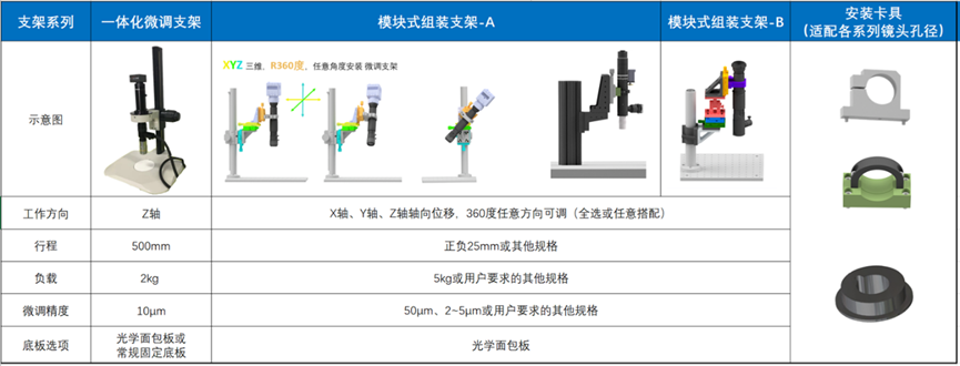 模块式 按需集成支架(轴向、精度、角度可调) 除标准Z轴聚焦支架外,可根据用户的聚焦轴向,提供多轴精细聚焦的精密光学支架模块,搭配各类镜筒安装模块,协助用户实现不限角度、不限聚焦轴向的精细聚焦: