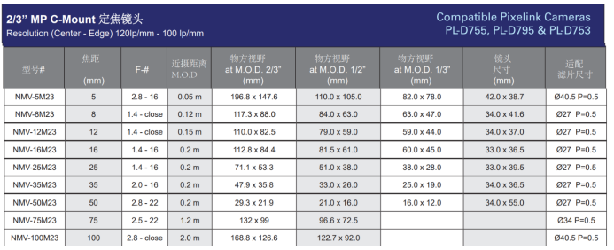 2/3”百万像素C接口镜头: