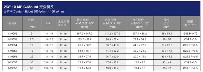 2/3”千万像素C接口镜头(支持10MP):