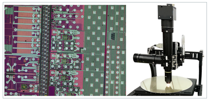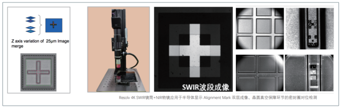 在半导体对位检测应用中,非常多的被测体都具有多层重合的结构特性。因此通常面对需要对多层结构进行对位操作,且对位标记(Alignment mark)尺寸非常小的成像检测要求。这就需要视觉检测系统同时实现高解析度、以及对表面及表面以下的多层对位标记融合成像。 传统方式看多层半导体结构是通过移动Z轴,分别对上下层成像。效率相对较低,同时精度也受影响。 我们为用户提供了一套高解析度宽视场的短波红外成像系统,用红外光源+红外镀膜高清显微镜头+短波红外相机,一次性同时实现样品表面上下层的标记成像,协助检测设备实现高效率和高精度的对位目标 。